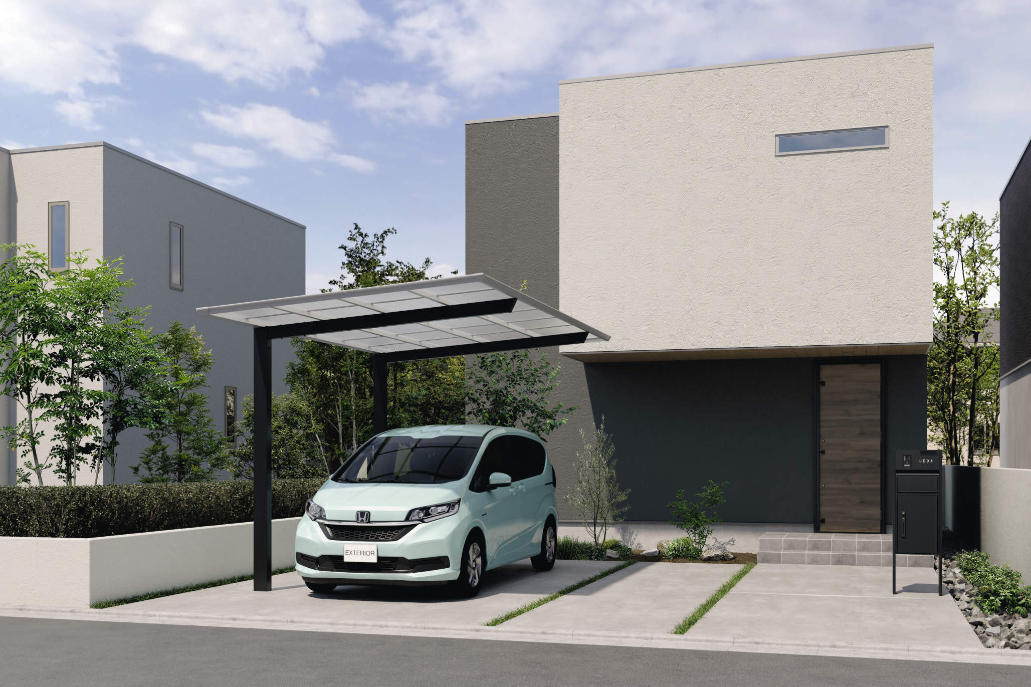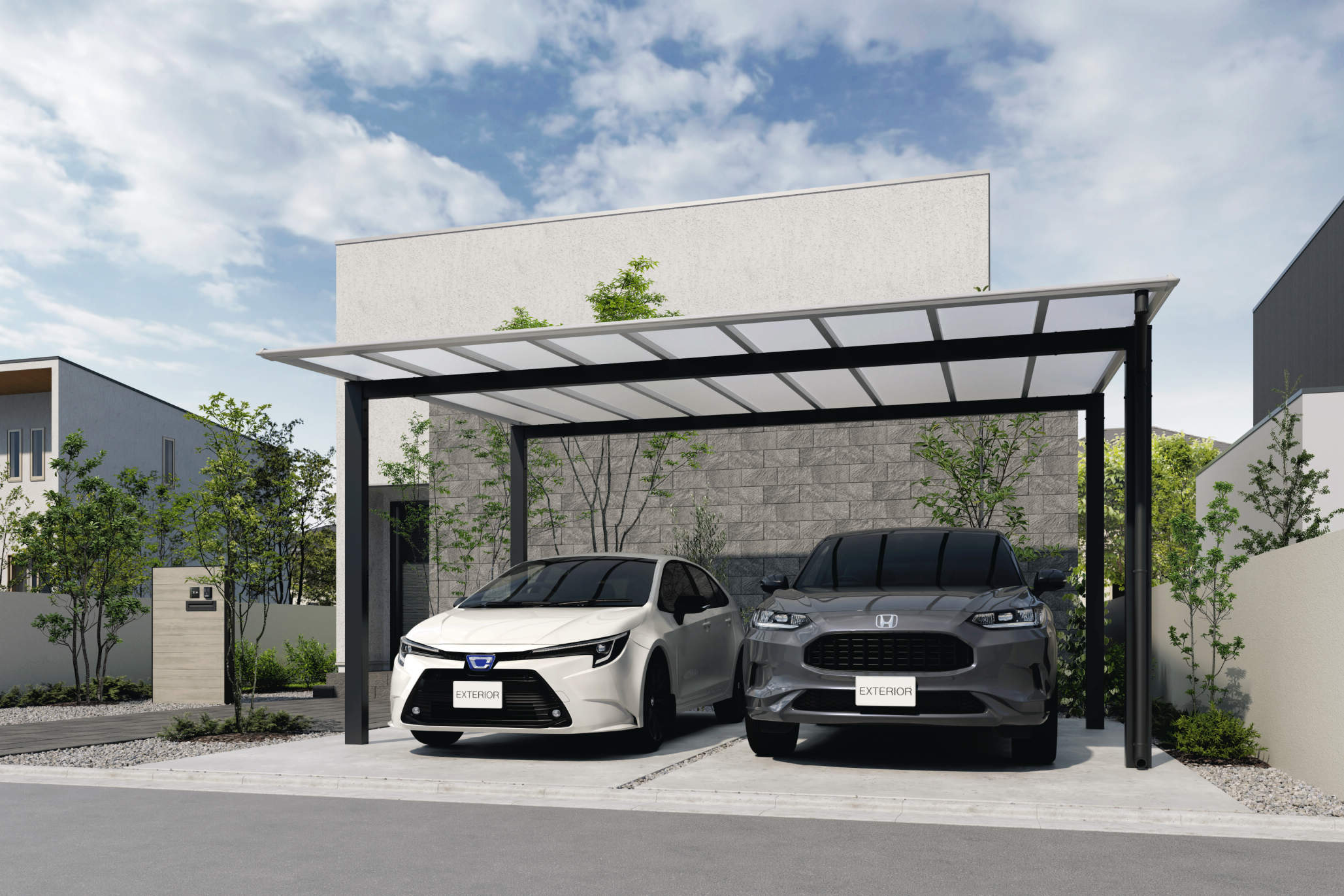 一つ目はカーポートのパネル材に業界初となる「ブラックポリカーボネート板」を採用